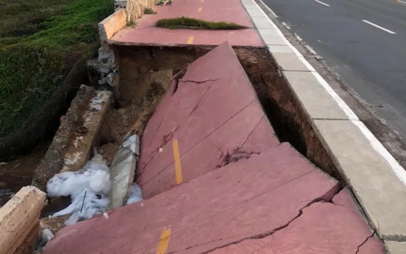 Água rompe tubulação e destrói parte da ciclovia da Orla Sul em Aracaju — Foto: Defesa Civil