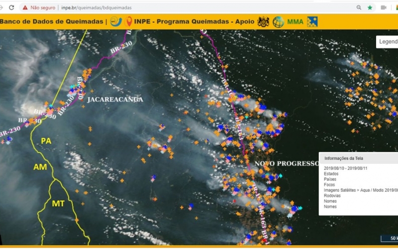 As medições do Inpe confirmaram o pico de queimadas (veja imagem acima). Novo Progresso, junto com o município de Altamira, liderou o número de focos durante aquele final de semana. As duas cidades também estão entre as mais atingidas neste mês.