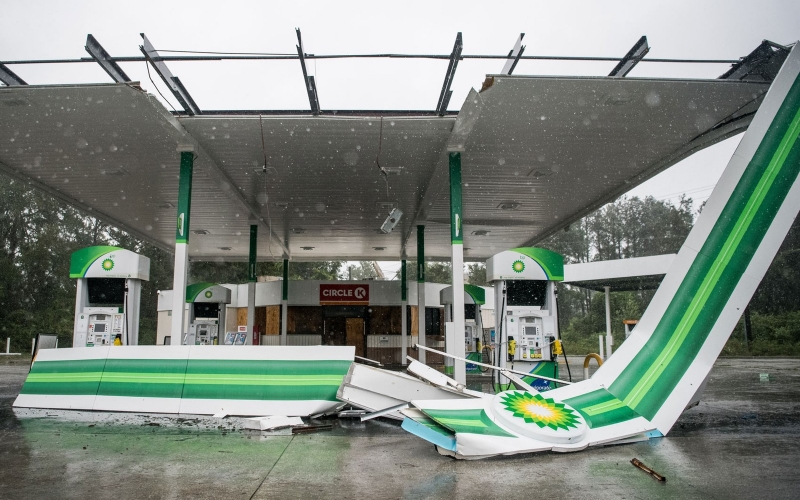 Posto de gasolina com cobertura destruída pela passagem do furacão Dorian perto de Pawley's Island, na Carolina do Sul, na quinta-feira (5) — Foto: Sean Rayford/Getty Images/AFP