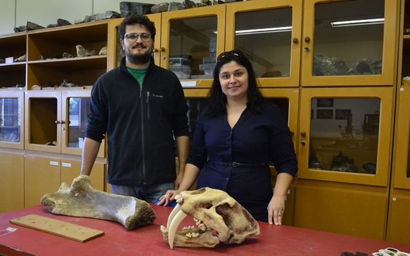 Heitor e Paula encontraram pegadas de animal pre-histórico, e agora querem prosseguir estudos — Foto: Fernando Halal/FURG
