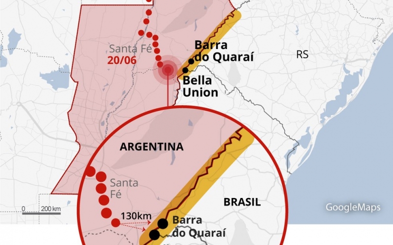 A nuvem de gafanhotos que avança pela Argentina está a 130 km em linha reta do município brasileiro de Barra do Quaraí, no oeste do Rio Grande do Sul, de acordo com o último levantamento do governo argentino. Para meteorologistas, a chegada vai depender da condição climática no Sul nos próximos dias.