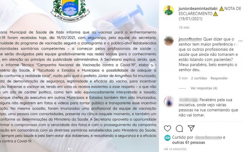 A decisão do prefeito do município de Itabi, Júnior de Amynthas, (DEM), de 46 anos, de tomar a vacina contra a Covid-19, nesta terça-feira (19), durante o início da vacinação na cidade dividiu opiniões.