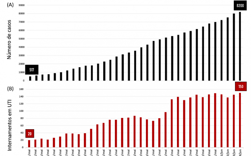 A análise foi elaborada com base nos boletins epidemiológicos da secretaria estadual de Saúde entre os dias 1º de maio e 4 de junho, considerando o número de casos acumulados da covid-19, a quantidade de leitos disponíveis na rede de saúde, o número de internamentos e a taxa de ocupação em UTI dentro dessa série histórica.