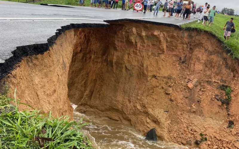 No vídeo é possível ver que dois buracos abriram nas partes laterais da pista. A princípio o motivo seria o transbordamento de um córrego.