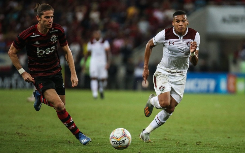 Filipe Luis e Fernando Pacheco em ação no Fla-Flu — Foto: LUCAS MERÇON/ FLUMINENSE F.C.