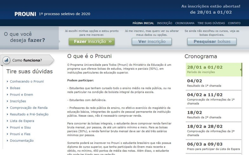 O cronograma do Prouni previa que as inscrições abrissem nesta terça (28). Mas, até as 22h, o site do Prouni ainda não estava permitindo que o candidato se inscrevesse.