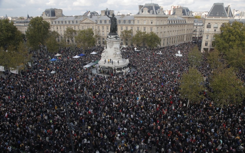 Manifestantes se reúnem na Praça da República, em Paris, neste domingo (18) para marchar em homenagem ao professor de história decapitado em um ataque extremista — Foto: Michel Euler/AP