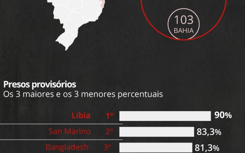Assim como no levantamento anterior, as taxas de aprisionamento por estado continuam discrepantes. O Acre tem a maior taxa do país, com 927 presos para cada 100 mil habitantes. Esse percentual é superior ao registrado por todos os países do ranking. Já a Bahia tem a menor taxa do Brasil, com 103 presos para cada 100 mil. Nesse caso, a taxa é próxima às de Luxemburgo, Canadá e Itália.