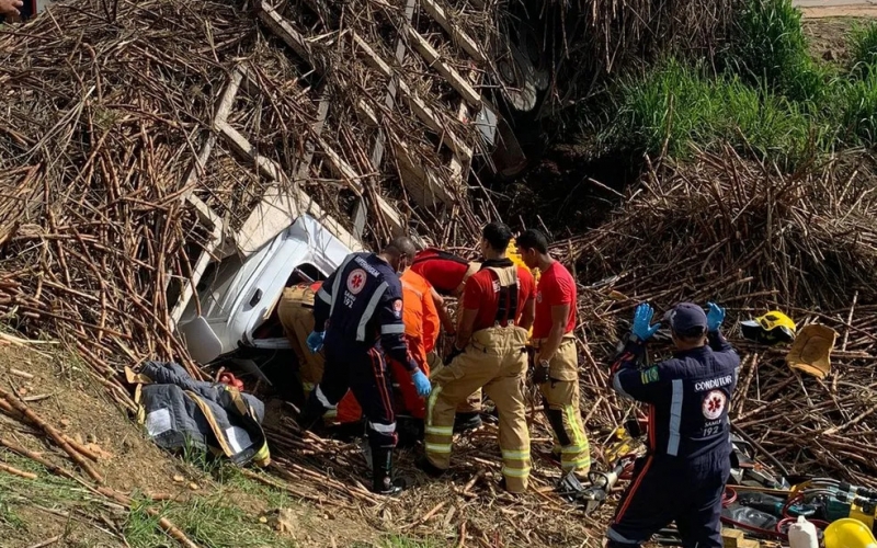 Equipes do Corpo de Bombeiros trabalham no local para retirar o motorista das ferragens. Com o tombamento, parte da carga caiu sobre a cabine.