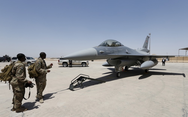 Militares norte-americanos obsevam jato F-16 na base em Balad — Foto: Reuters
