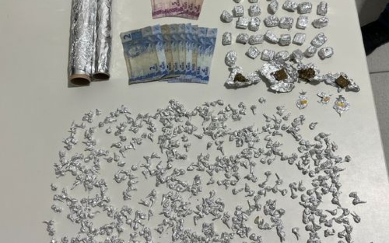 Durante a abordagem a um suspeito, foram encontradas aproximadamente 600 pedras de crack prontas para o consumo, além de 40 porções de maconha e papel alumínio utilizado na embalagem das drogas.
