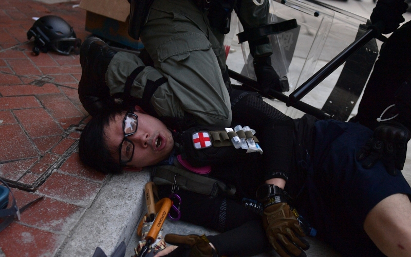Polícia prende manifestante durante protesto em Hong Kong, nesta terça-feira (1º) — Foto: Nicolas Asfouri / AFP