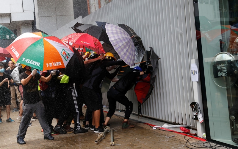 Os manifestantes usaram barras de metal e um carrinho de ferro para estourar portas e janelas de vidro do prédio do Conselho Legislativo. Eles protestam contra a crescente influência do governo chinês sobre a região.
