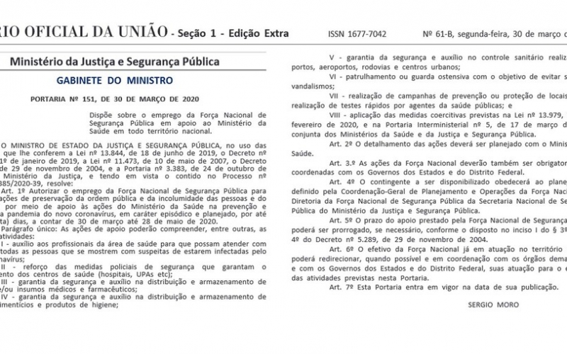 Uma portaria do ministro da Justiça e Segurança Pública, Sérgio Moro, autorizou nesta segunda-feira (30) o emprego da Força Nacional de Segurança Pública para dar apoio ao Ministério da Saúde nas ações de combate ao novo coronavírus.