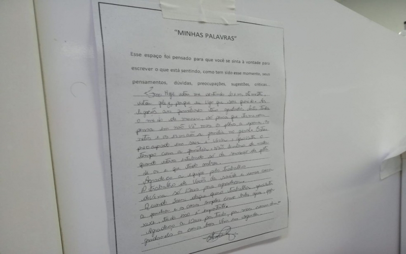 Elas foram escritas pelo paciente Jeferson Rodrigues, de 47 anos, na despedida dele após 21 dias de internamento. Foi no ambiente cercado por carinho, que ele usou o serviço de vídeo chamada para comunicar a esposa a notícia que estava curado.
