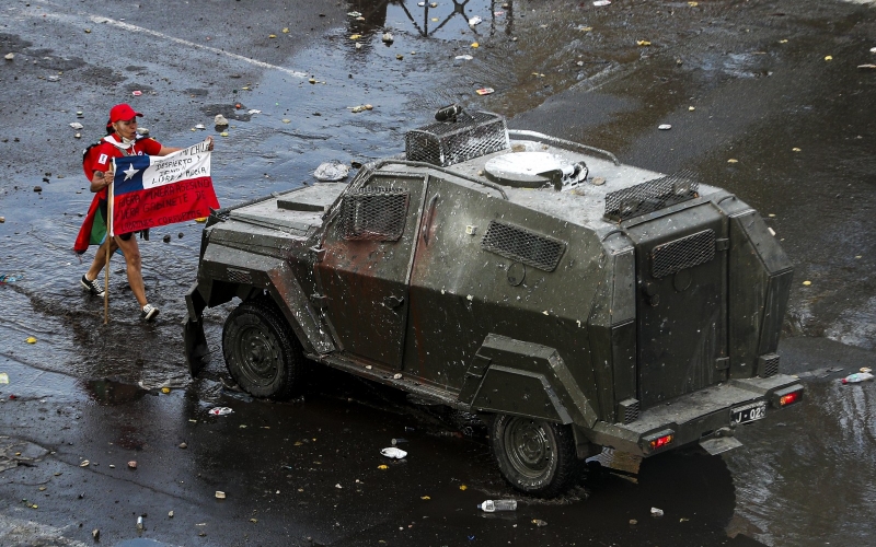 Manifestante segura bandeira do Chile em frente a blindado militar em protesto em Santiago nesta terça-feira (22) — Foto: Esteban Felix/AP Photo