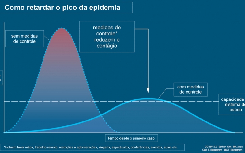 Gráfico elaborado pelo cientista Drew Harris e adaptado pelo biólogo Carl Bergstrom mostra como medidas de prevenção podem retardar o contágio da Covid-19 e evitar o colapso do sistema de saúde — Foto: Carl Bergstrom e Esther Kim/CC BY 2.0