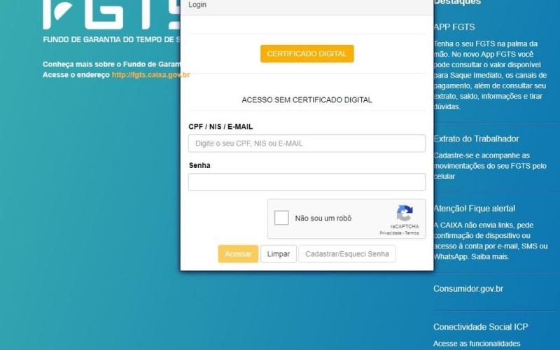 2. O trabalhador deve informar o CPF, número do NIS ou e-mail cadastrado no sistema da Caixa e a senha também cadastrada anteriormente. Depois precisa apertar "Não sou um robô e a tecla acessar:
