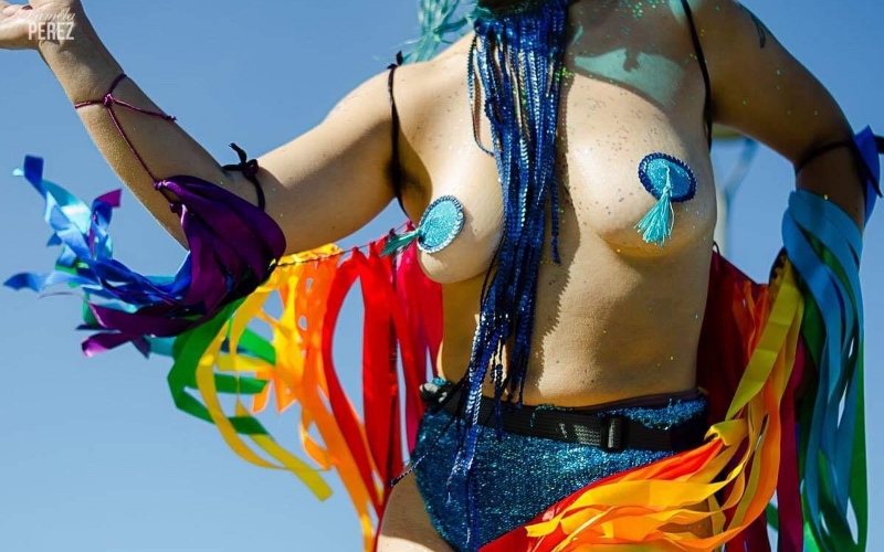 "Eu costumo sempre usar um lenço ou amarrar um pano entre um bloco e outro, já passei por situações desagradáveis. Uma vez, eu estava na perna de pau, usando tassels e um cara já beijou minha bunda", lembra ela.