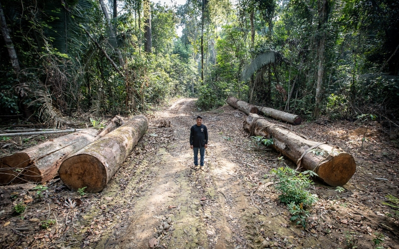 Foto feita em outubro deste ano mostra o indígena Batiti Karipuna ao lado de troncos derrubados na terra Karipuna, em Rondônia, uma das mais desmatadas do país — Foto: Fábio Tito/G1
