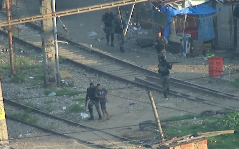Suspeito é conduzido por policial na comunidade do Jacarezinho, no Rio — Foto: Reprodução/ TV Globo